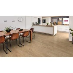 Rene former, samt skinnende overflader i indretningen indfanges med det naturligt, matte look og den storslåede virkning af laminatgulvet Gran Via 4V på en elegant måde. Både med et naturligt egemønster, og med det diskret rustikke mønster Kastanje bianco.